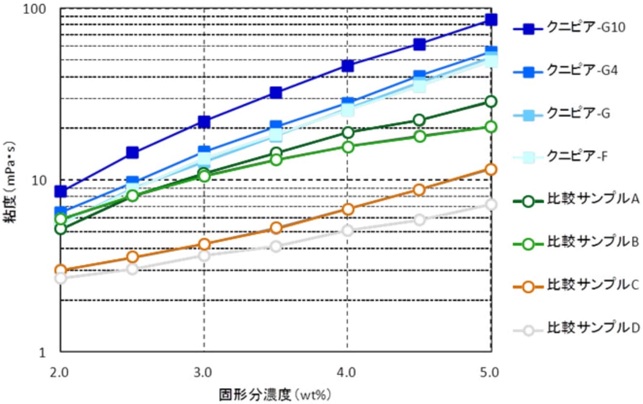 精製ベントナイト(クニピア)の粘度と固形分濃度比較